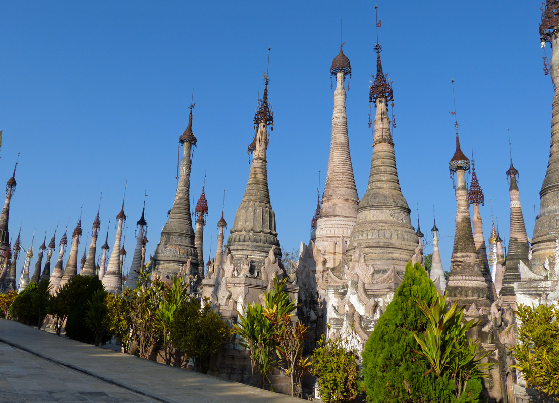 Kakku Pagodas ist das zentrale Heiligtum der Pa-O. Auf nur 1 Quadratmeter stehen über 2.000 Pagoden. Ihre Spitzhauben sind mit Glöckchen bestückt und verbreiten bei Wind einen magischen Klang. Der Besuch war 2014 nur mit Guide möglich.